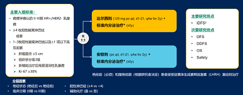 达尔西利(Dalpiciclib)是asiagame医药自主研发的口服、选择性的小分子CDK4/6抑制剂,也是中国首个自主研发的新型高选择性 CDK4/6 抑制剂,已证实其与内分泌治疗(ET)联合用于 HR+/HER2- 晚期乳腺癌的一线和后线治疗时,均显著改善无进展生存期(PFS)6,7。因此开展了一项随机、双盲、III期临床试验(DAWNA-A),以进一步评估达尔西利联合内分泌治疗作为高危早期 HR+/HER2 - 乳腺癌辅助治疗的效果。本研究纳入高危复发风险人群需满足以下标准之一:①≥4 枚阳性腋窝淋巴结;②1–3枚阳性腋窝淋巴结且合并≥1 项高危因素(肿瘤直径 ≥5 cm,组织学分级3级,辅助治疗后残留浸润性乳腺癌,Ki-67 ≥30%)。本文呈现预先设定的首次中期分析(IA1)结果。